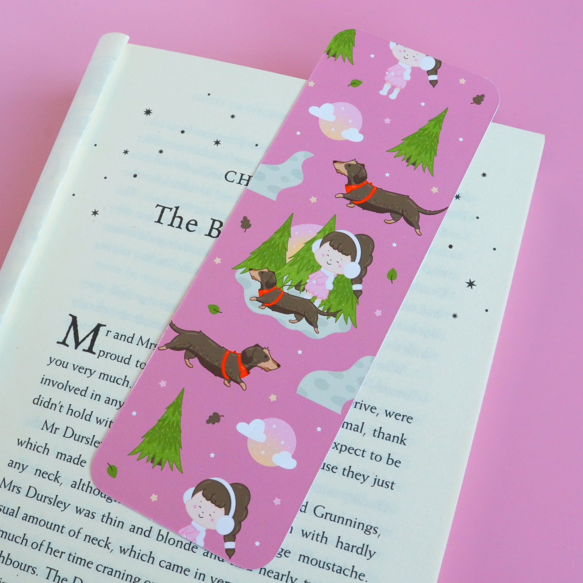 For the woodland wanderers and little-joy seekers 🌿✨ This bookmark features Joy strolling through the woods with Otis, the wire-haired dachshund, beneath a soft pink sunrise/sunset sky. Keep it in your favourite book as a reminder to pause, breathe, and enjoy life’s peaceful, happy moments!