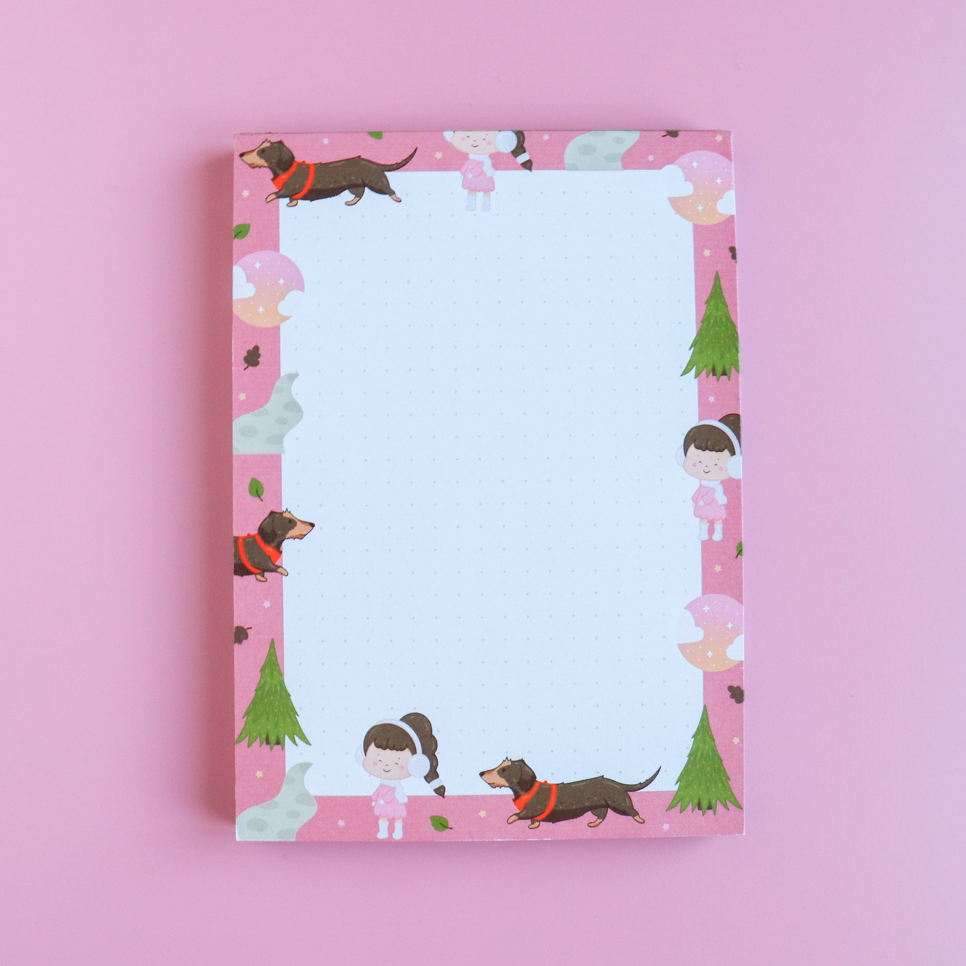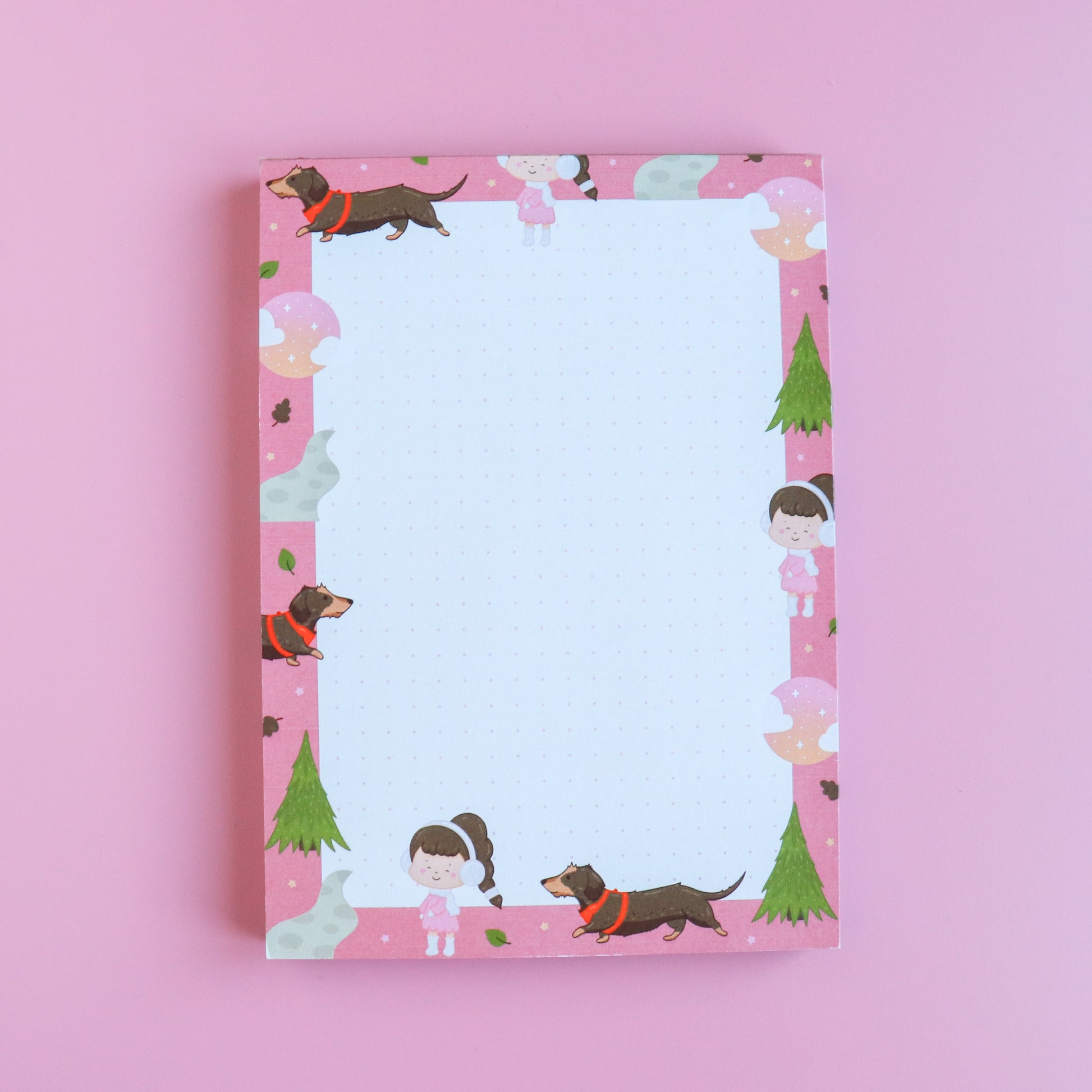 Jot down your thoughts, doodles, or little daily joys with this A Woodland Walk A6 dotted notepad. Featuring Joy strolling through the woods with Otis, the wire-haired dachshund, beneath a soft pink sunrise/sunset sky, this 50-page, 120gsm notepad is perfect for keeping your notes neat, cute, and full of woodland vibes! Its compact size makes it ideal for your desk, bag, or bedside table. A little escape to the woods whenever you need it!