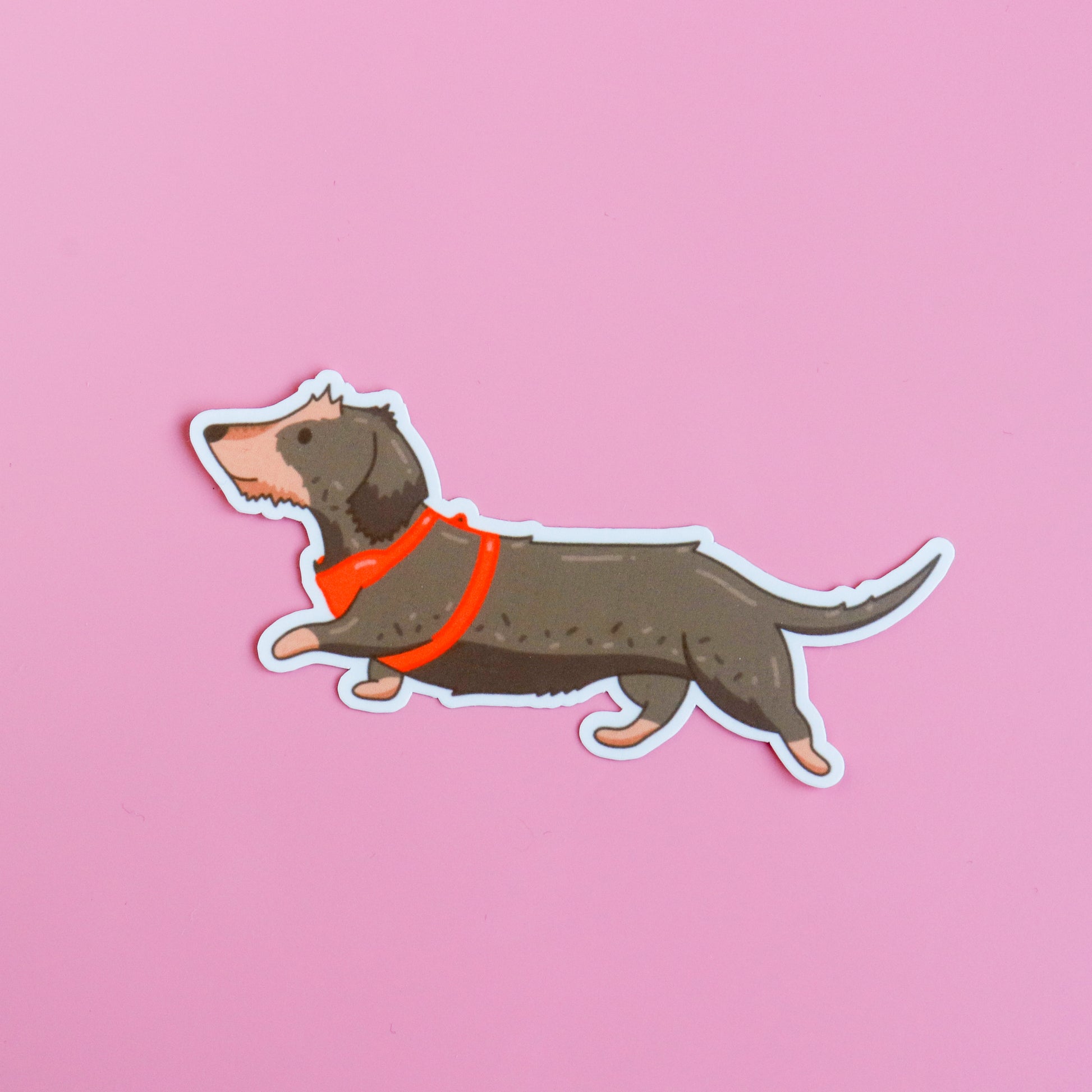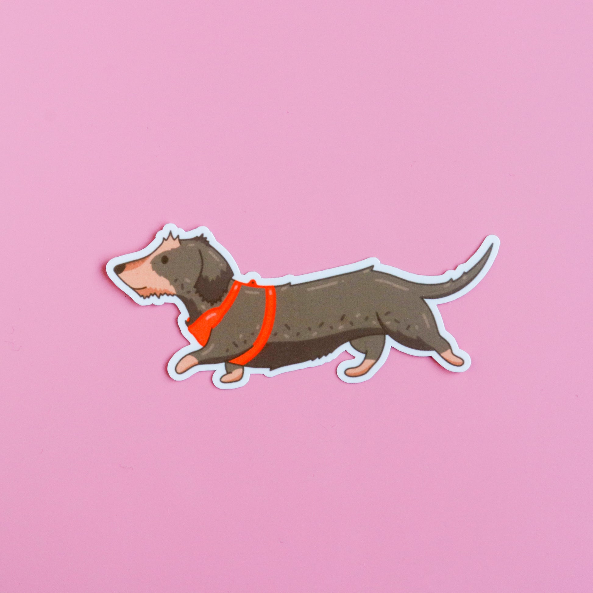 Stick a little joy wherever you like with this Otis die-cut sticker! Featuring Otis the wire-haired dachshund (brown & tan / wild boar) wearing his signature orange harness, this high-quality sticker is water-resistant and laminated with a frosted matte finish. Perfect for laptops, notebooks, water bottles, or anywhere you want to add a pop of personality and dachshund charm.